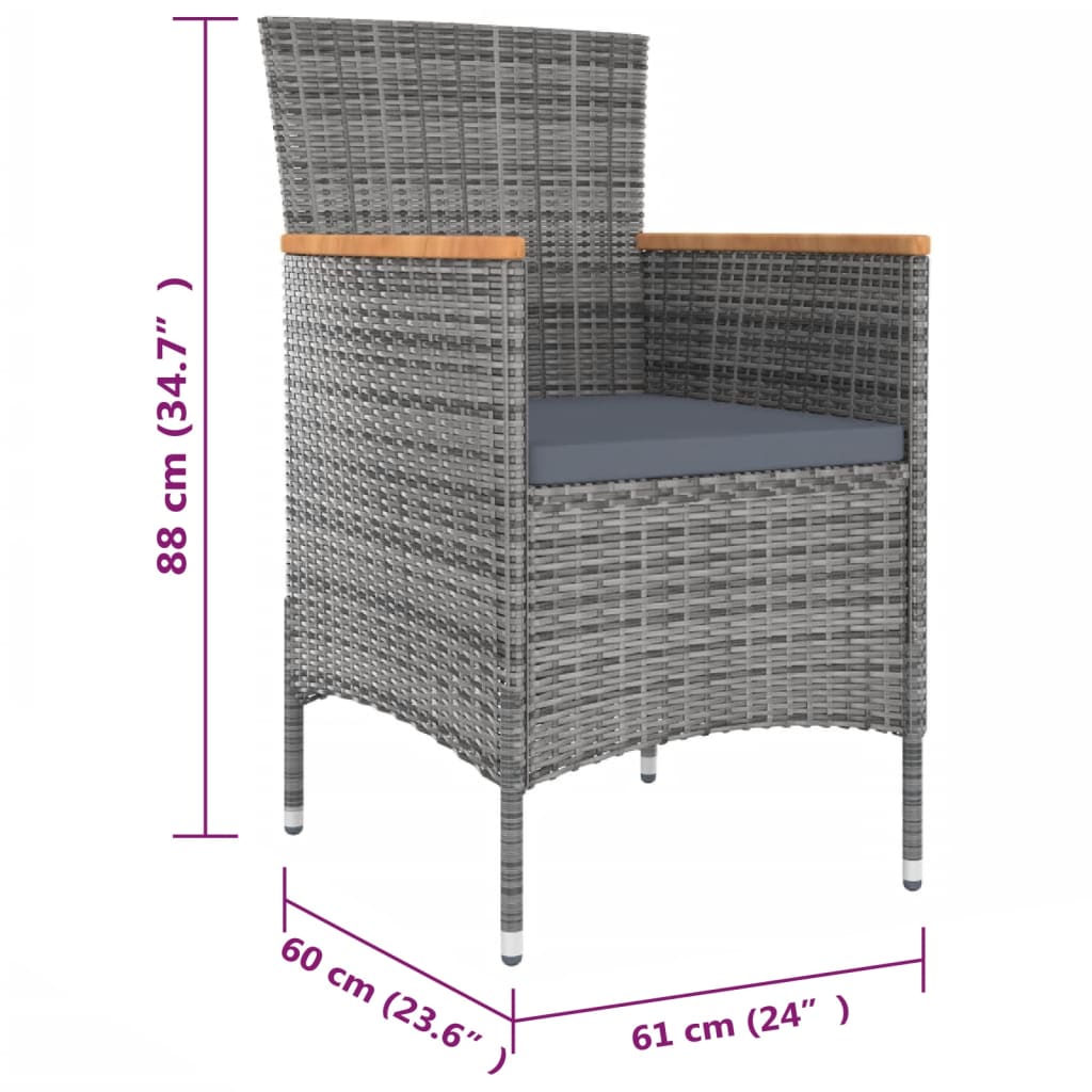 With a stylish design and a durable steel frame, this dining furniture set is a perfect choice for your outdoor living space. This garden dining set features a powder-coated steel frame, which makes the table and chairs stable and durable. Thanks to the weather-resistant PE rattan, the outdoor furniture set is easy to clean. The cushions are removable and easy to clean. Additionally, the thickly cushions add extra seating comfort. Note: In order to extend the life of your outdoor furniture, we recommend you to clean it regularly and do not leave it outdoors without protection unnecessarily.Clean: Use a mild soap solution.Storing: If possible, store in a cool, dry place indoors. If the product is stored outdoors, protect it with a waterproof cover. Wipe and dry the excess water or snow from flat surfaces after a rain or snowfall. Allow sufficient air circulation to avoid moisture-related damage.