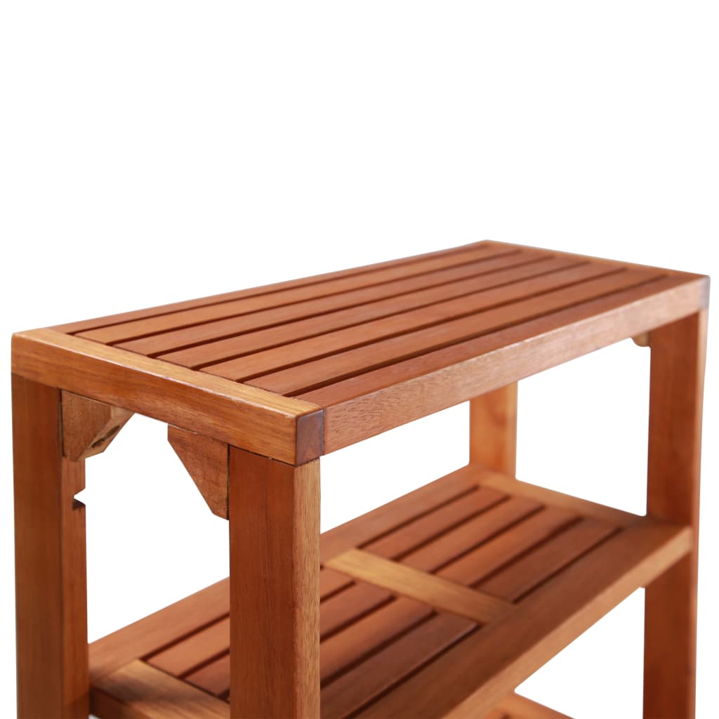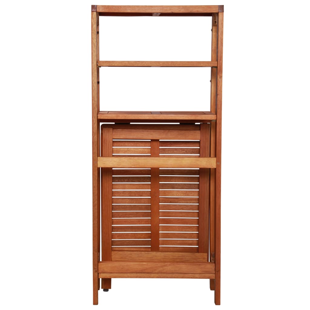 This wooden bistro set will make a great addition to your outdoor living space. Made of solid acacia wood, the set is weather-resistant and highly durable. The storage rack has been uniquely and functionally designed: you can use it as a table or keep it as a storage shelf according to your needs. The chairs can be folded and stored inside the table unit to save space when not in use. The bistro set is easy to assemble. Delivery includes 1 storage rack and 2 folding chairs.