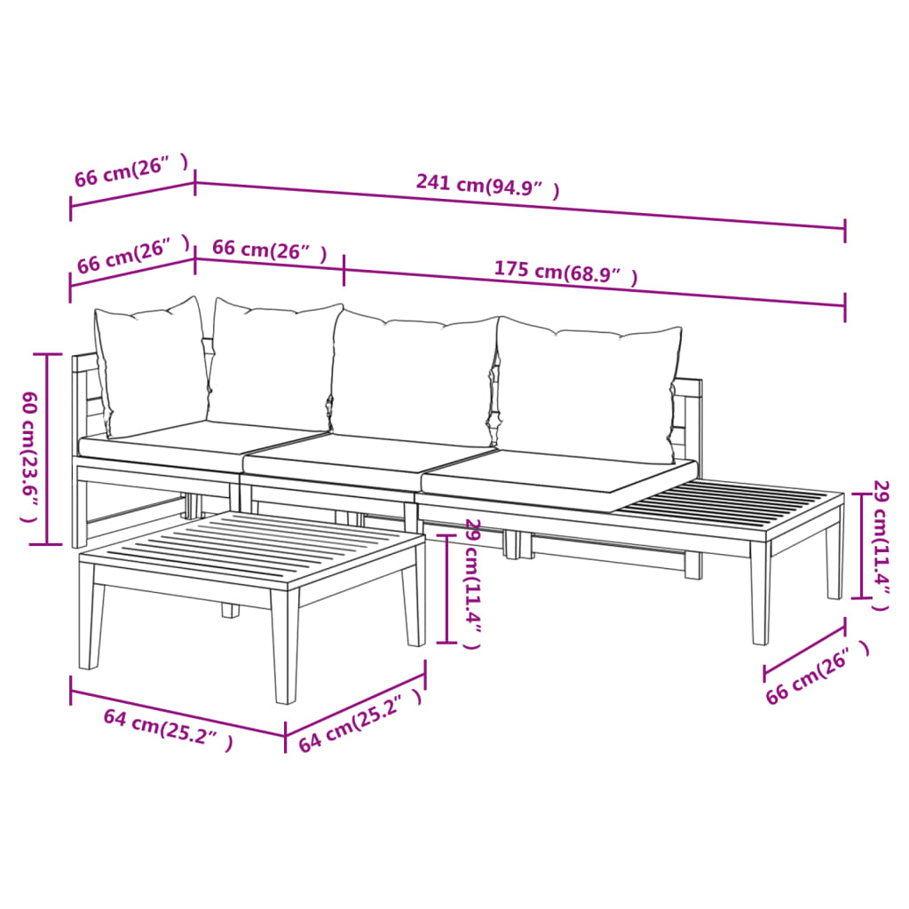 This wooden garden lounge set is an excellent choice for relaxing and enjoying the weather, taking a nap, or chatting with your family or friends. With a timeless design, the lounge set adds a touch of rustic charm to your patio, terrace or garden. Made of solid acacia wood, the outdoor furniture set is weather-resistant and highly durable. Combined with the thickly-padded cushions, this patio lounge set provides the utmost comfort. The table which matches with the bench can be assembled both on the left or right side according to your demands. You can also combine the sofa set with other modular segments to create your own personal garden lounge set configurations! Note: In order to extend the life of your outdoor furniture, we recommend you to clean it regularly and do not leave it outdoors without protection unnecessarily.Clean: Use a mild soap solution.Storing: If possible, store in a cool, dry place indoors. If the product is stored outdoors, protect it with a waterproof cover. Wipe and dry the excess water or snow from flat surfaces after a rain or snowfall. Allow sufficient air circulation to avoid moisture-related damage.