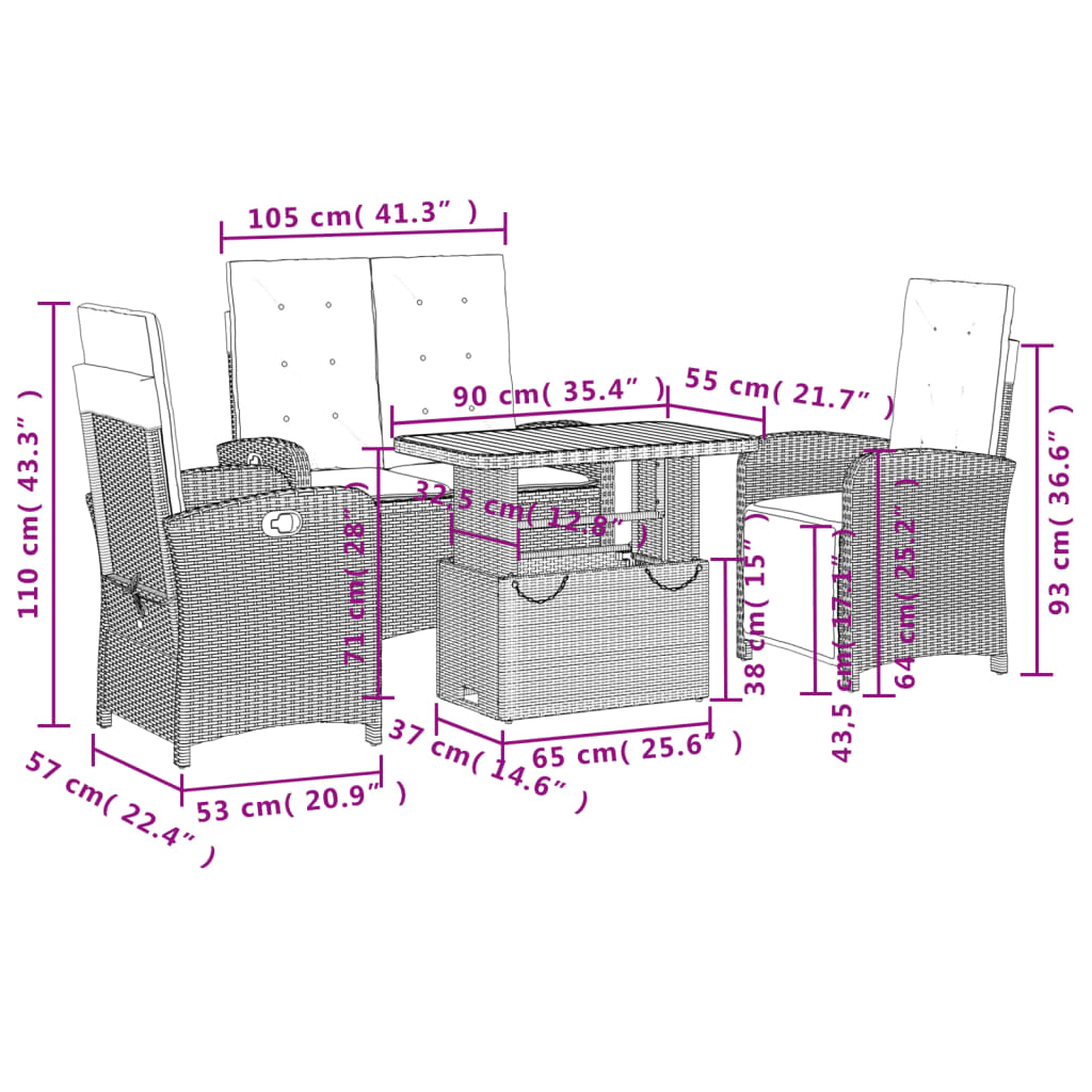 This garden dining set is a great choice for al fresco dining or just relaxing in the garden, backyard, or on the patio. Durable material: PE rattan, also known as poly rattan, is a strong, low-maintenance synthetic material that looks like natural rattan. It’s lightweight, easy to clean, and commonly used for outdoor furniture due to its durability and weather-resistant properties.Adjustable backrest: This garden seat has a handle. You can adjust the backrest to any position by pulling the handle, and quickly return it to its original position.Adjustable tabletop: The tabletop can be lifted to make the table higher, which transforms the outdoor table from a coffee table to a dining table. It’s perfect for having guests over or eating meals outside.Removable and washable cover: These seat cushions feature removable covers for easy washing and maintenance. The back cushions have a flap at the back for easy attachment to the backrests.Comfortable seat experience: This outdoor furniture, complete with thickly padded cushions, offers a comfortable seating experience. Good to know:To make sure your outdoor furniture stays beautiful, we recommend protecting it with a waterproof cover.