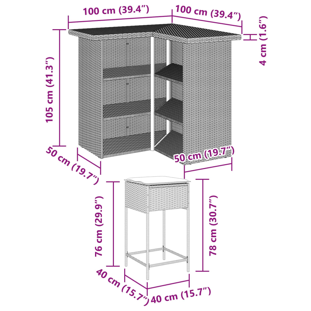 This trendy garden bar set, combining both style and function, is surely meant to be the centrepiece of your garden, patio, and any other living space. Durable material: PE rattan, also known as poly rattan, is a strong, low-maintenance synthetic material that looks like natural rattan. It’s lightweight, easy to clean, and commonly used for outdoor furniture due to its durability and weather-resistant properties.Comfortable seat experience: This outdoor furniture, complete with thickly padded cushions, offers a comfortable seating experience.Removable and washable cover: These seat cushions feature removable covers for easy washing and maintenance.Robust and stable frame: The powder-coated steel frame ensures that the garden furniture is strong and stable for daily outdoor use. Good to know:To make sure your outdoor furniture stays beautiful, we recommend protecting it with a waterproof cover.