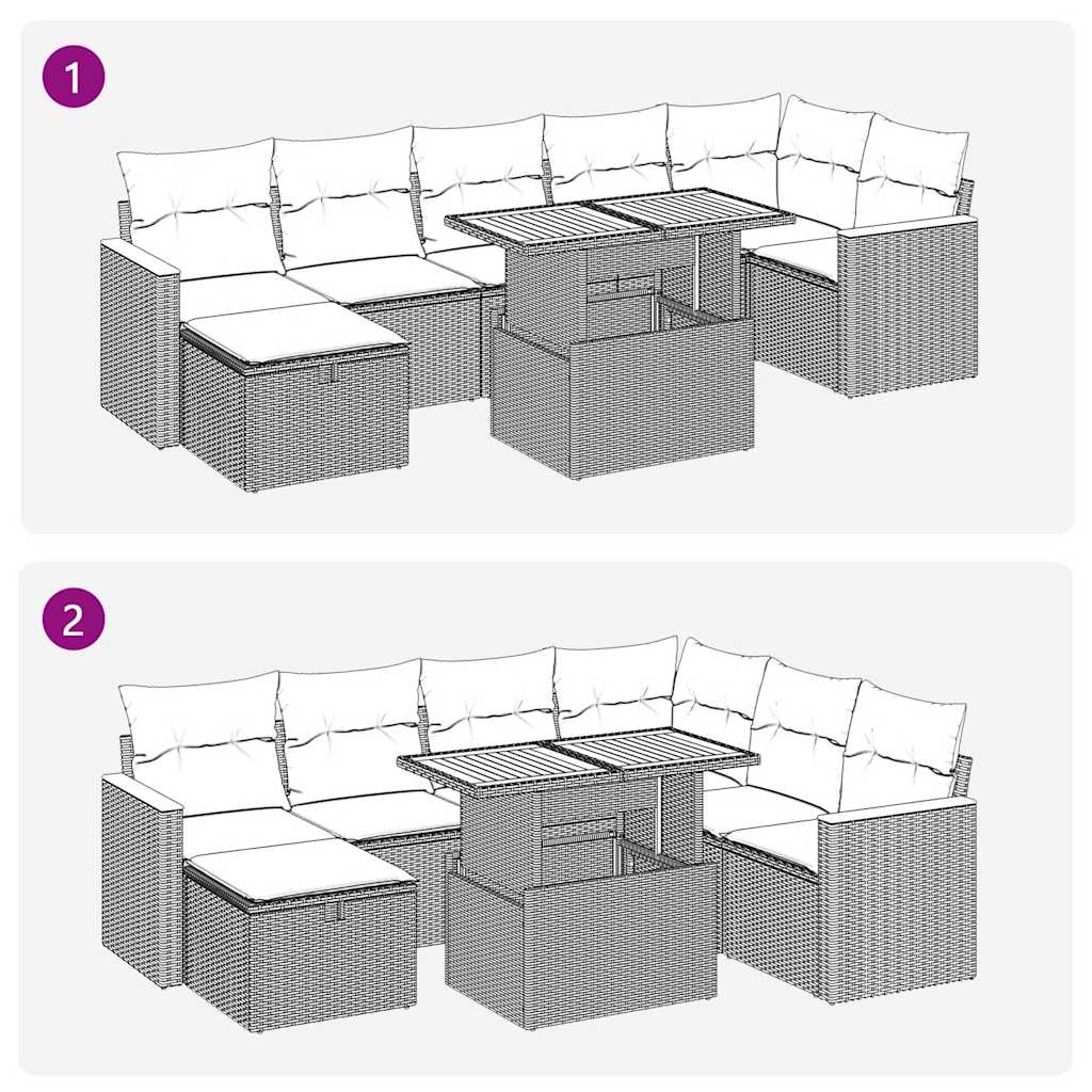 This garden sofa set is the perfect addition to your backyard, terrace, or patio, providing a comfortable and inviting space for chatting with family and friends or simply relaxing and enjoying the outdoors. Durable material: PE rattan, also known as poly rattan, is a strong, low-maintenance synthetic material that looks like natural rattan. It’s lightweight, easy to clean, and commonly used for outdoor furniture due to its durability and weather-resistant properties.Storage function with water-resistant bag: Each garden seat features a storage space under the seat, complete with a water-resistant bag for storing cushions, toys, and other items. The inner bag has a top cover and can be securely fastened to the seat with hook-and-loop fasteners for added stability.Adjustable tabletop: The tabletop can be lifted to make the table higher, which transforms the outdoor table from a coffee table to a dining table. It’s perfect for having guests over or eating meals outside.Versatile footstool: The stool is versatile, serving as a comfortable footrest for when you’re lounging on the sofa or as an extra seat in your garden.Removable and washable cover: These seat cushions feature removable covers for easy washing and maintenance.Robust and stable frame: The powder-coated steel frame is strong, stable, durable, and resistant to corrosion and harsh weather, ensuring long-lasting performance. Good to know:To make sure your outdoor furniture stays beautiful, we recommend protecting it with a waterproof cover.