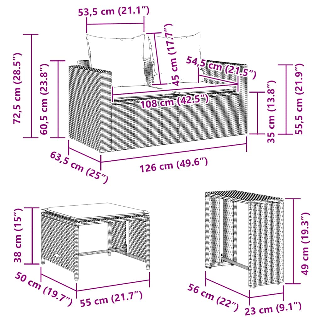 This garden sofa set is the perfect addition to your backyard, terrace, or patio, providing a comfortable and inviting space for chatting with family and friends or simply relaxing and enjoying the outdoors. Durable material: PE rattan, also known as poly rattan, is a strong, low-maintenance synthetic material that looks like natural rattan. It’s lightweight, easy to clean, and commonly used for outdoor furniture due to its durability and weather-resistant properties.Comfortable seat experience: This outdoor furniture, complete with thickly padded cushions, offers a comfortable seating experience.Removable and washable cover: These seat cushions feature removable covers for easy washing and maintenance.Stackable for space saving: This outdoor sofa set can be conveniently stacked into a compact rectangular structure, making it easy to store and ideal for maximising space when not in use.Modular design: This outdoor furniture set has a modular design, making it completely flexible and easy to move around, so you can create a customised outdoor furniture arrangement. Good to know:To make sure your outdoor furniture stays beautiful, we recommend protecting it with a waterproof cover.