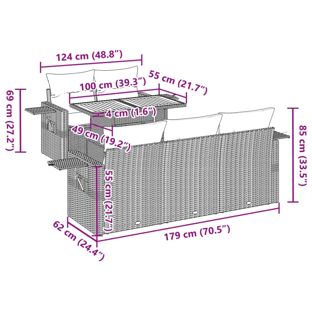 This garden sofa set is the perfect addition to your backyard, terrace, or patio, providing a comfortable and inviting space for chatting with family and friends or simply relaxing and enjoying the outdoors. Durable material: PE rattan, also known as poly rattan, is a strong, low-maintenance synthetic material that looks like natural rattan. It’s lightweight, easy to clean, and commonly used for outdoor furniture due to its durability and weather-resistant properties.Storage function with water-resistant bag: The garden furniture features storage space under the seat, complete with a water-resistant bag for storing cushions, toys, and other items. The inner bag can be securely fastened to the outdoor furniture with hook-and-loop fasteners for added stability.Adjustable tabletop: The tabletop can be lifted to make the table higher, which transforms the outdoor table from a coffee table to a dining table. It’s perfect for having guests over or eating meals outside.Removable and washable cover: These seat cushions feature removable covers for easy washing and maintenance.Modular design: This outdoor furniture set has a modular design, making it completely flexible and easy to move around, so you can create a customised outdoor furniture arrangement. Good to know:To make sure your outdoor furniture stays beautiful, we recommend protecting it with a waterproof cover.