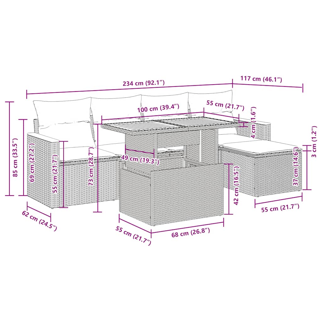 This garden sofa set is the perfect addition to your backyard, terrace, or patio, providing a comfortable and inviting space for chatting with family and friends or simply relaxing and enjoying the outdoors.Durable material: PE rattan, also known as poly rattan, is a strong, low-maintenance synthetic material that looks like natural rattan. It’s lightweight, easy to clean, and commonly used for outdoor furniture due to its durability and weather-resistant properties.Storage function with water-resistant bag: Each garden seat features storage space under the seat, complete with a water-resistant bag for storing cushions, toys, and other items. The inner bags have a top cover and can be securely fastened to the seats with hook-and-loop fasteners for added stability.Removable and washable cover: These seat cushions feature removable covers for easy washing and maintenance.Modular design: This outdoor furniture set has a modular design, making it completely flexible and easy to move around, so you can create a customised outdoor furniture arrangement.Good to know:To make sure your outdoor furniture stays beautiful, we recommend protecting it with a waterproof cover.