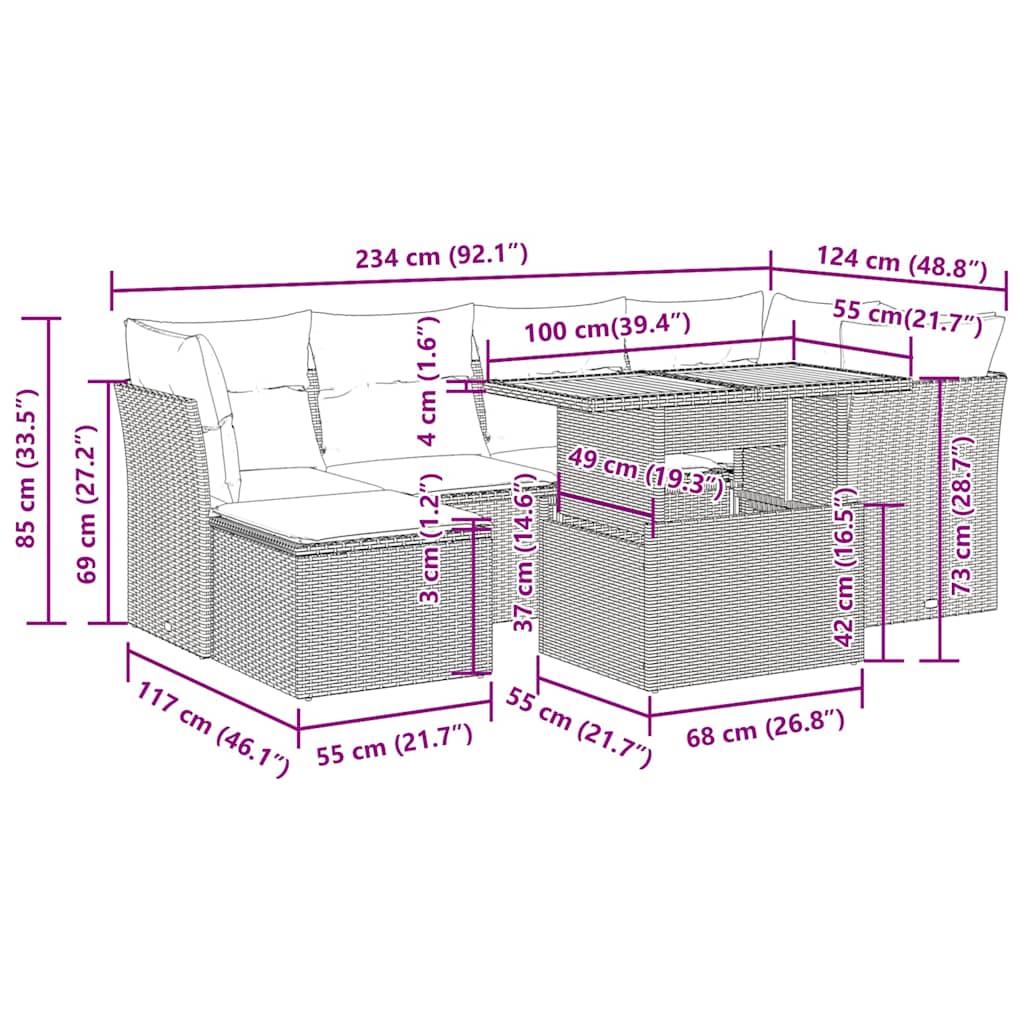 This garden sofa set is the perfect addition to your backyard, terrace, or patio, providing a comfortable and inviting space for chatting with family and friends or simply relaxing and enjoying the outdoors. Durable material: PE rattan, also known as poly rattan, is a strong, low-maintenance synthetic material that looks like natural rattan. It’s lightweight, easy to clean, and commonly used for outdoor furniture due to its durability and weather-resistant properties.Storage function with water-resistant bag: The garden furniture features storage space under the seat, complete with a water-resistant bag for storing cushions, toys, and other items. The inner bag can be securely fastened to the outdoor furniture with hook-and-loop fasteners for added stability.Adjustable tabletop: The tabletop can be lifted to make the table higher, which transforms the outdoor table from a coffee table to a dining table. It’s perfect for having guests over or eating meals outside.Removable and washable cover: These seat cushions feature removable covers for easy washing and maintenance.Modular design: This outdoor furniture set has a modular design, making it completely flexible and easy to move around, so you can create a customised outdoor furniture arrangement. Good to know:To make sure your outdoor furniture stays beautiful, we recommend protecting it with a waterproof cover.