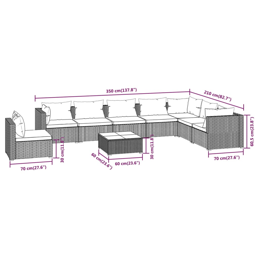 Enjoy your relaxing time with this trendy garden lounge set! It can meet a variety of different needs. Sturdy frame: This patio lounge set features a sturdy powder coating steel frame and plastic chrome feet, which is highly durable.Premium material: The garden sofa set is designed with water-resistant PE rattan, making it easy to clean, hard-wearing, and suitable for daily outdoor use.Modular design: The modular design also makes it possible to place the set in any arrangement or combine them with other modular segments to meet your needs.Added sitting comfort: The thickly padded and removable cushions and pillows provide optimal comfort for your outdoor sitting experience. Note:In order to extend the life of your outdoor furniture, we recommend you to clean it regularly and do not leave it outdoors without protection unnecessarily.Clean: Use a mild soap solution.Storing: If possible, store in a cool, dry place indoors. If the product is stored outdoors, protect it with a waterproof cover. Wipe and dry the excess water or snow from flat surfaces after a rain or snowfall. Allow sufficient air circulation to avoid moisture-related damage.