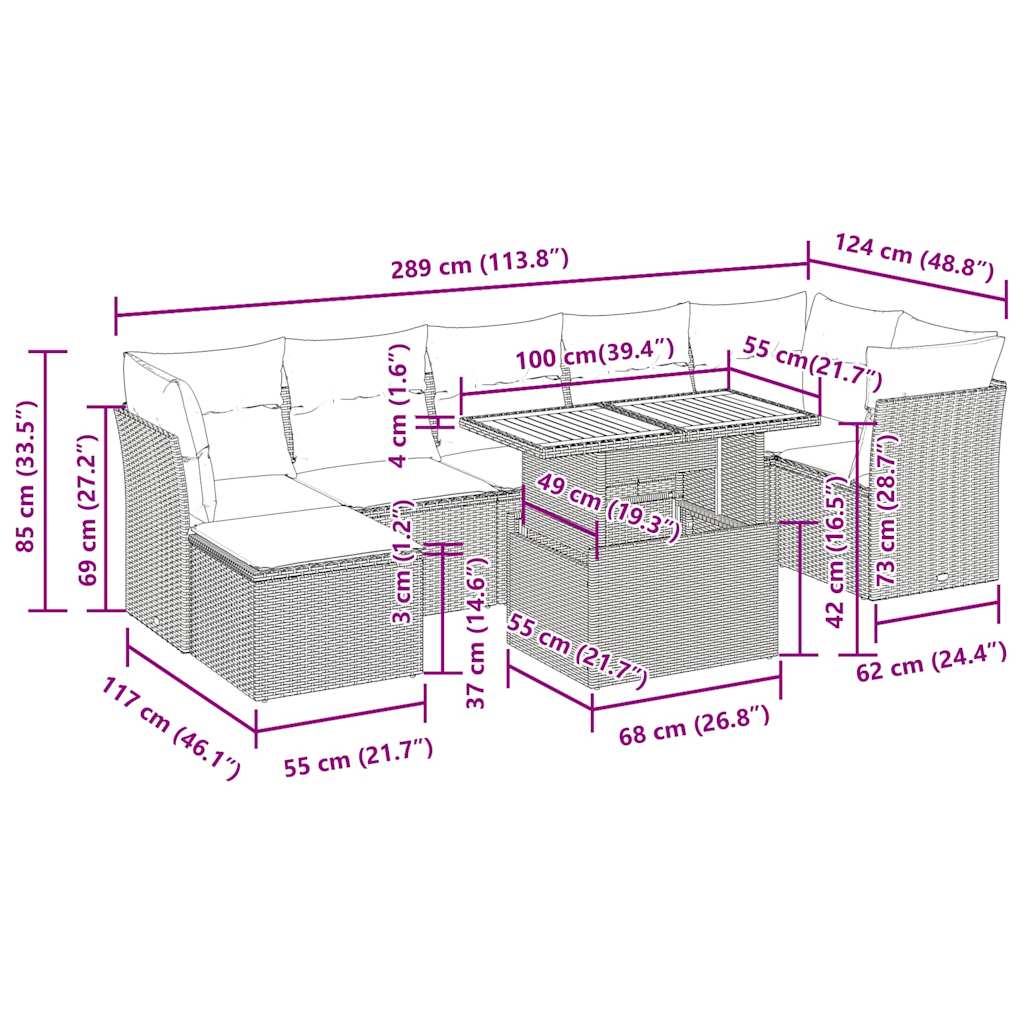 This garden sofa set is the perfect addition to your backyard, terrace, or patio, providing a comfortable and inviting space for chatting with family and friends or simply relaxing and enjoying the outdoors. Durable material: PE rattan, also known as poly rattan, is a strong, low-maintenance synthetic material that looks like natural rattan. It’s lightweight, easy to clean, and commonly used for outdoor furniture due to its durability and weather-resistant properties.Storage function with water-resistant bag: The garden furniture features storage space under the seat, complete with a water-resistant bag for storing cushions, toys, and other items. The inner bag can be securely fastened to the outdoor furniture with hook-and-loop fasteners for added stability.Adjustable tabletop: The tabletop can be lifted to make the table higher, which transforms the outdoor table from a coffee table to a dining table. It’s perfect for having guests over or eating meals outside.Removable and washable cover: These seat cushions feature removable covers for easy washing and maintenance.Modular design: This outdoor furniture set has a modular design, making it completely flexible and easy to move around, so you can create a customised outdoor furniture arrangement. Good to know:To make sure your outdoor furniture stays beautiful, we recommend protecting it with a waterproof cover.