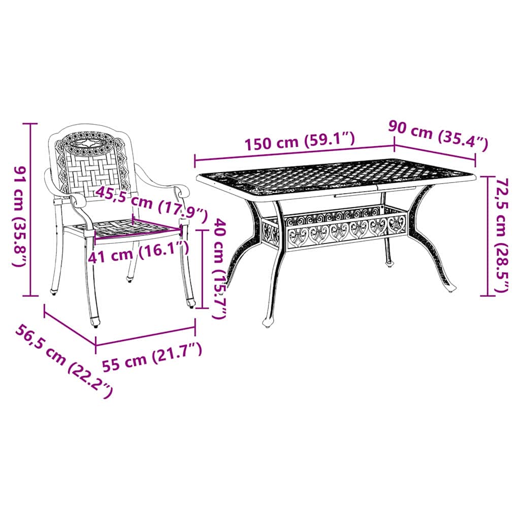 This Garden Dining Set, with its rectangular shape, adds a lovely touch of tradition to any outdoor spot. It’s got a timeless look with classic bits, and it’s fully made of strong aluminium, making it perfect for big parties or chilled family meals in the fresh air. Built to withstand the outdoors, this set creates a welcoming vibe that makes every outdoor meal enjoyable. Materials: Made from aluminium, this dining set shows off its strong and weather-resistant traits. This material means it lasts and can handle all sorts of weather – rain, heat, and wind – so you can count on it all year round. Included Components: The rectangular dining layout gives you heaps of seating and dining space, great for both big gatherings and cozy dinners. The sturdy frames offer solid support and look the part in your outdoor area. Features/Function/Design: With a traditional design, these pieces mix style and practicality, making the most of your outdoor space. Its roomy setup creates a friendly atmosphere that brings people together. Recommended Uses: Perfect for gardens and terraces, this set is a winner for spring and summer events like brunches, evening meals, or lively garden parties. Care & Maintenance: Just wipe the surfaces with a dry cloth to keep it looking ace. If it’s pouring rain or snowing heavily, it’s best to cover the set for added protection.