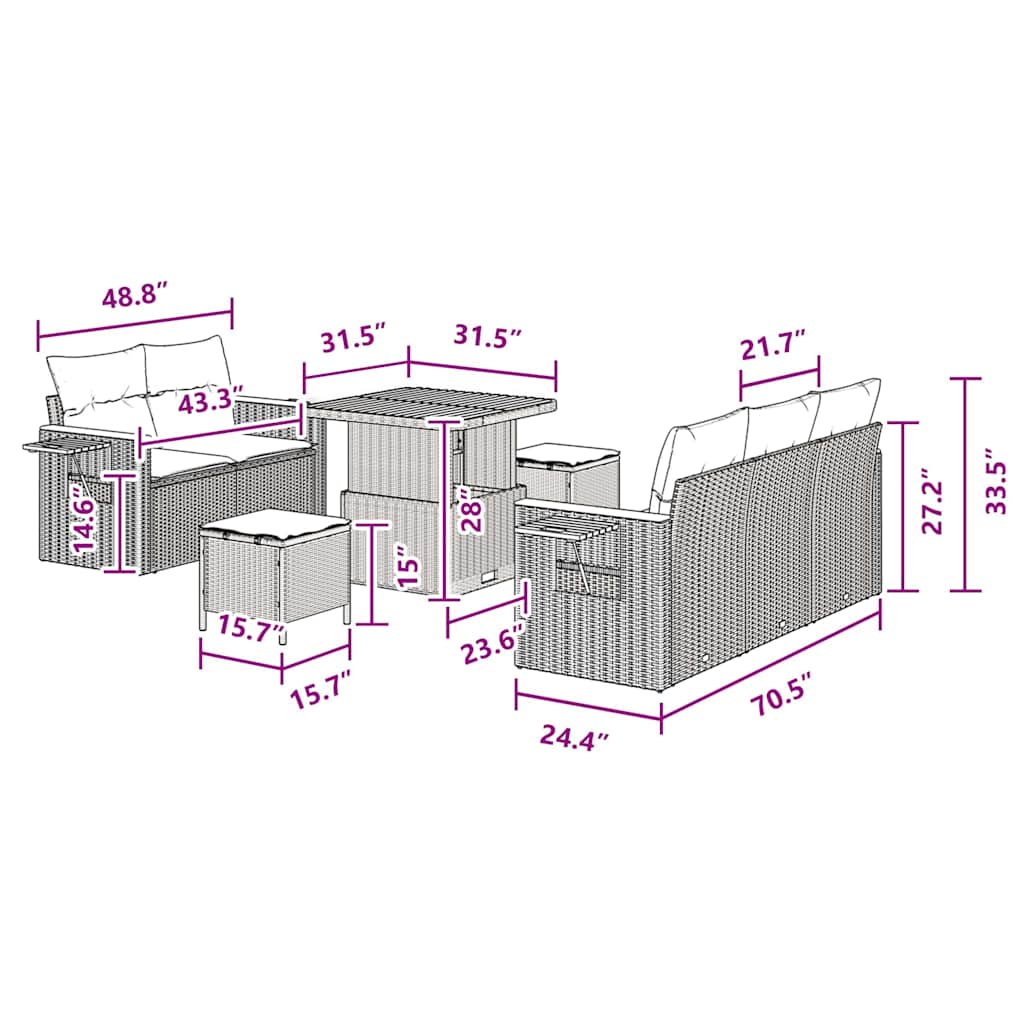 This snazzy Garden Sofa Set hits the sweet spot between practical and stylish, making it a top choice for outdoor hangouts. The woven texture adds a nice touch while creating a cosy vibe for get-togethers or just chillin’solo. Designed for outdoor use, it’s all about simplicity and modern looks that fit right in gardens and terraces. With clean lines and no fuss, this set is all about enjoying its crafted charm. Materials: Made from durable poly rattan with powder-coated steel and solid acacia wood for a long-lasting look. The UV protection means it can take the sun without fading. Included Components: The set features arm sofas with storage, a middle seat, square stools, and a table. Each piece is smartly designed for comfort and utility, with handy storage options for your outdoor bits and bobs. Unique Features: Thanks to the UV-resistant materials, it’s tough for outdoor use and built to last. The cushions are removable and replaceable, making it super easy to keep things clean and fresh. Practical Uses: Perfect for spring and summer, this modular set enhances gardens and terraces with its stylish vibe. Great for relaxed chats, entertaining mates, or just enjoying some alone time in nature. Care & Maintenance: Just pop a cover on when you’re not using it and wipe it down with a damp cloth for a quick clean. The care instructions are straightforward, so keeping it looking nice takes hardly any effort.