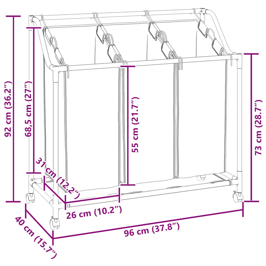 Imagine how energy-saving and convenient to keep your dirty clothes organized, as well as transport them easily to your laundry room, our user-friendly laundry sorter makes it possible! This laundry sorter organizes any laundry room, utility room or closet well, making it the perfect choice to meet your individual needs. It has three, full-size sorting bags which can be easily removed to transport laundry using the steel carrying handles. Additionally, castors and handles on each end of the cart are ideal to facilitate movement. The durable steel frame supports large loads of laundry up to 20 kg. It is also easy to assemble and maintain.