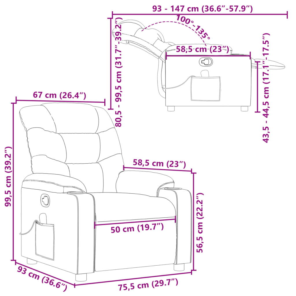 Sit back and drift away in this highly comfortable massage recliner chair! Manual reclining function: This reclining chair has a handle on the right side. You can manually adjust the footrest and the backrest to any position as per your comfort with a simple pull of the handle. This feature allows for a maximum tilt of 135 degrees. Additionally, the backrest can go quickly back to the original place with an easy pull of the handle.Vibration function: The featured 6 massage points let you experience a better-targeted massage. Additionally, the included hand control allows you to pick different massage programs. The massage function is powered by the USB connector, but the certified 5V USB power source is not included.Comfortable seat experience: The thickly padded seat, backrest, and wide armrests covered in faux leather provide a cosy sensation, making you feel embraced while seated. The faux leather is a highly durable material. It is resistant to stain, making it easy to clean with a damp cloth. The smooth surface also gives a luxurious look and the beauty of real leather.Convenient cup holders and side pocket: This armchair has two convenient cup holders for your drinks and a side pocket for your remote control or keeping your essential items within easy reach.Solid and stable frame: The frame made of wood and metal provides a strong structure and stability. This reclining armchair is comfortable and durable.