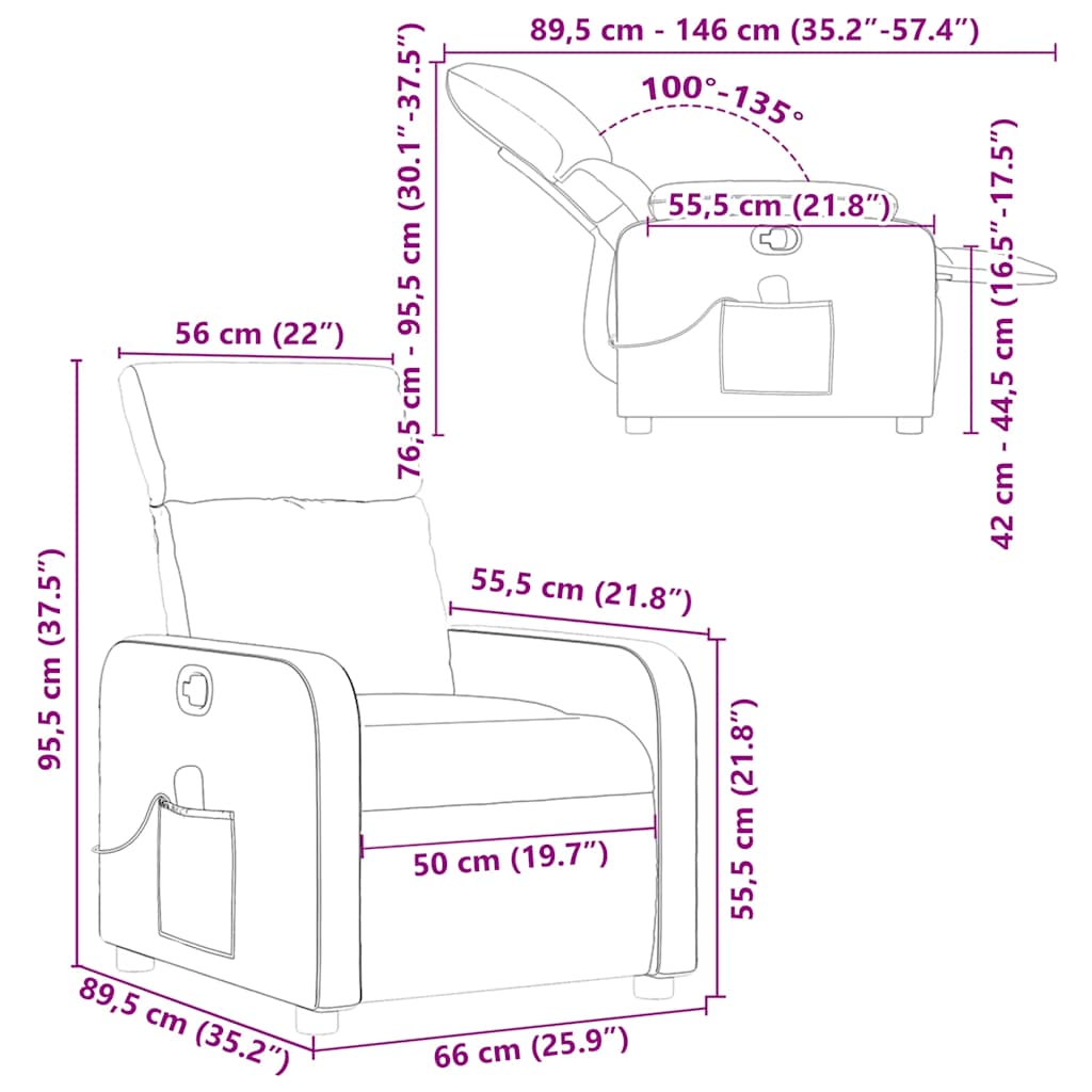 Sit back and drift away in this highly comfortable massage recliner chair! Manual reclining function: This reclining chair has a handle on the right side. You can manually adjust the footrest and the backrest to any position as per your comfort with a simple pull of the handle. This feature allows for a maximum tilt of 135 degrees. Additionally, the backrest can go quickly back to the original place with an easy pull of the handle.Vibration function: The featured 6 massage points let you experience a better-targeted massage. Additionally, the included hand control allows you to pick different massage programs. The massage function is powered by the USB connector, but the certified 5V USB power source is not included.Comfortable seat experience: The thickly padded seat, backrest, and wide armrests covered in faux leather provide a cosy sensation, making you feel embraced while seated. The faux leather is a highly durable material. It is resistant to stain, making it easy to clean with a damp cloth. The smooth surface also gives a luxurious look and the beauty of real leather.Convenient side pocket: This armchair has a side pocket for your remote control or keeping your essential items within easy reach.Solid and stable frame: The frame made of wood and metal provides a strong structure and stability. This reclining armchair is comfortable and durable.