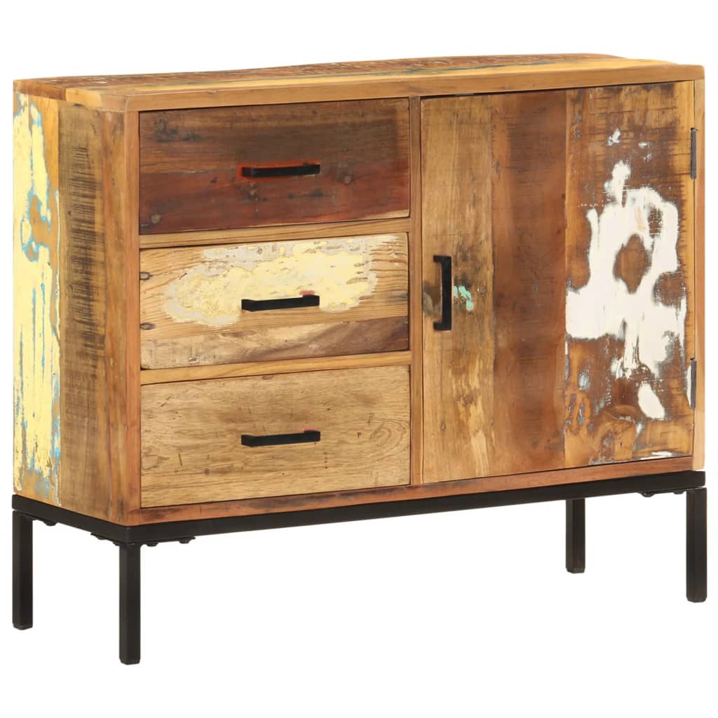 This wooden sideboard makes a practical as well as a charming decorative addition to your home. This cabinet is made of solid reclaimed wood that is sourced from joists, floors and support beams from old and demolished buildings, making them an environmentally friendly option in furniture making. It is a mix of reclaimed timbers, including pine, teak, beech, mango wood, etc., which means the reclaimed wood retains the characteristics of these different types of wood. The powder-coated iron frame adds extra stability. The side cabinet features 3 slide-out drawers and 1 door to keep books, magazines and other items well-organised and keeps your room tidy. Additionally, the sturdy top is ideal for displaying decorative objects, photo frames, or potted plants. Important note: The wood grains vary from piece to piece, making each piece unique. The delivery is random, ensuring the exclusivity and individuality of your product.