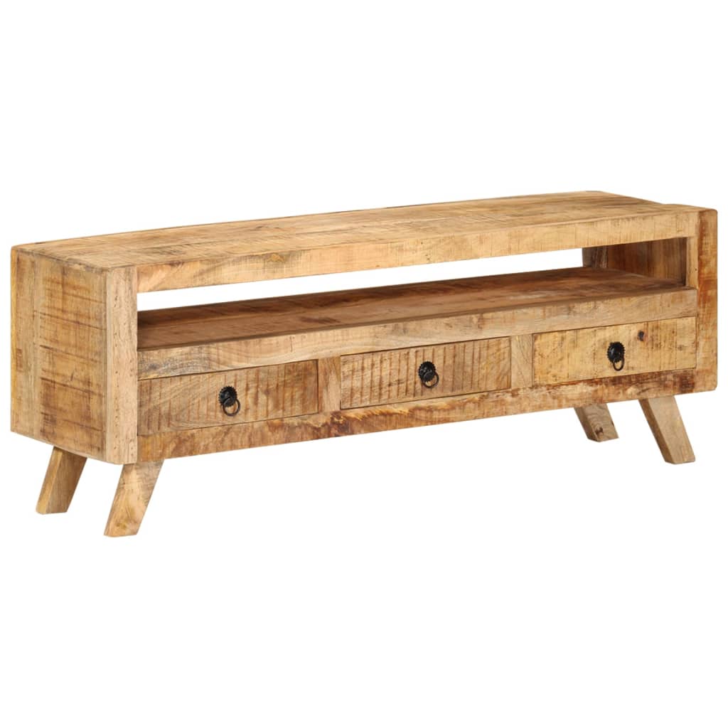 This stylish wooden TV cabinet is very practical and it will make a great addition to your living room or bedroom. Made of solid mango wood, the TV unit is highly durable and easy to clean. Signs of wear and visible grain structure give each piece its own history and a unique look. Every step of the process is carried out with the greatest care, be it recombining, polishing, painting or waxing. It is equipped with 3 drawers and 1 shelf, which provide ample storage space for your personal belongings. Important note: Colours vary from piece to piece, making each piece unique. The delivery is random, ensuring the exclusivity and individuality of your product.