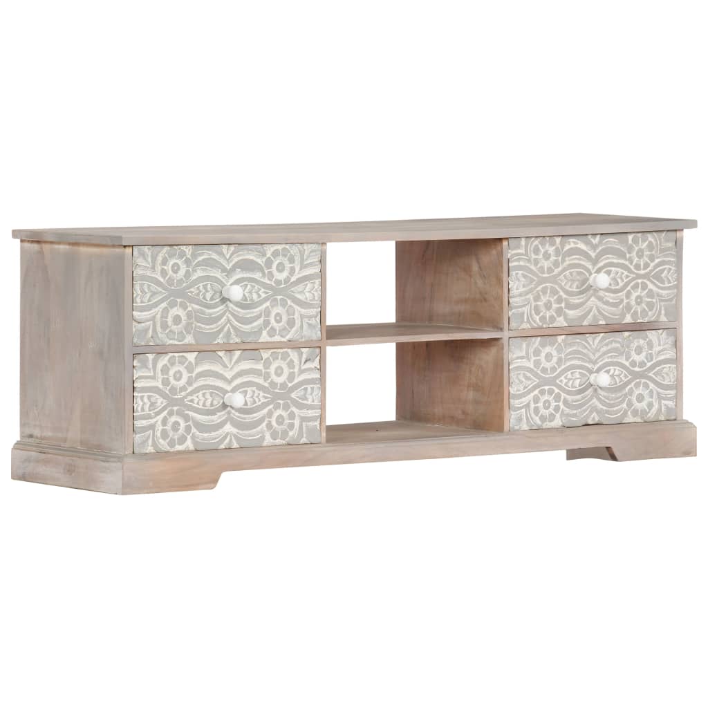 This wooden TV cabinet with exquisite carved patterns will make a timeless addition to your interior. This HiFi cabinet is made of solid acacia wood that has been given a white finish to give it a beautiful look and bright colour. The craftsmanship and the graceful wood grains make every piece of furniture extraordinary and slightly different from the next. Additionally, the perfect craftsmanship guarantees that every step of the process is carried out with the greatest care, be it polishing, painting and lacquering. The elegant hand-carved patterns on the drawer front surface add to the cabinet’s beauty. This lowboard features 4 drawers and 2 compartments, providing ample space for keeping your multimedia devices, books, as well as various items neatly organised. Important note: The grains vary from piece to piece, making each piece unique. The delivery is random, ensuring the exclusivity and individuality of your product.