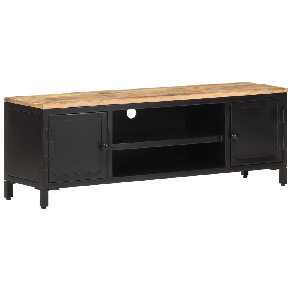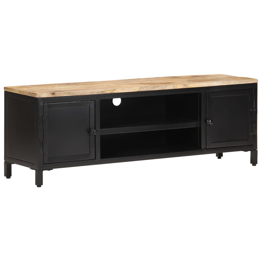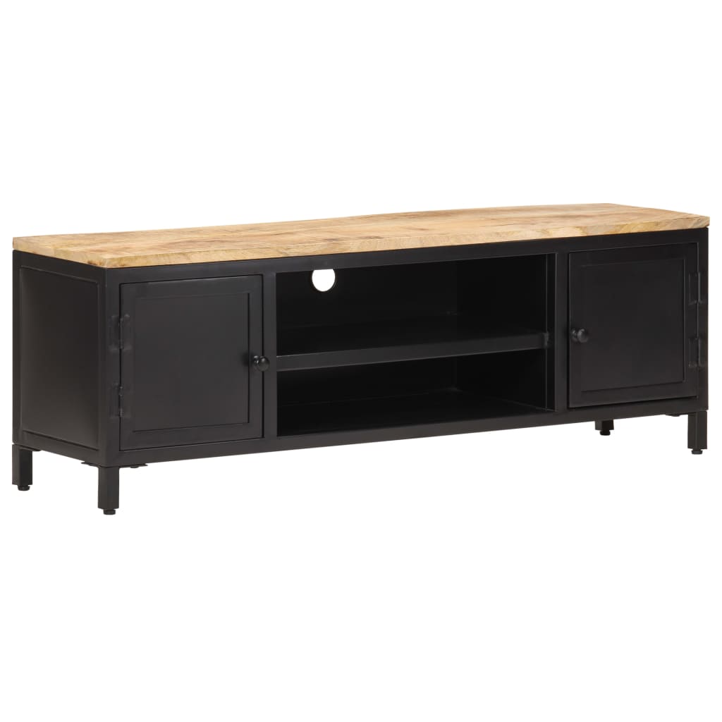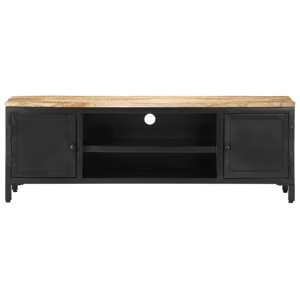 If you’re looking to add a classic touch of industrial charm to your interior decor, this solid rough mango wood and iron TV cabinet is here! The tabletop is made of solid rough mango wood, which is a hardwood with dense grains. Rough mango wood not only has the strength to bear the weight but also stands the wear and tear of time. Thanks to its powder-coated iron legs, this beautifully-designed cabinet is stable, durable, and eye-catching. This lowboard with two compartments provides ample space for storing your multimedia appliances, books, as well as various other items. Important note: The colours vary from piece to piece, making each piece unique; the delivery is random as well.