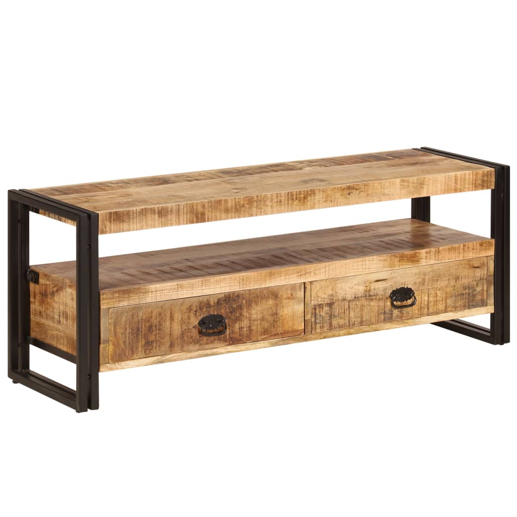 This beautiful mango wooden TV cabinet is trendy yet practical that will be a focal point of your room. This vintage-style TV cabinet is made of solid mango wood, enabling it highly stable and durable. Mango wood is a dense and robust hardwood which has beautiful brown or golden streaks and contours on its surface. Every step of the process is carried out with the greatest care, be it polishing, painting or lacquering. Thanks to the reinforced steel frame, the TV stand is extremely steady. It has two drawers for storing knick-knacks and a shelf for keeping multimedia appliances, gaming consoles and magazines. The TV stand can also be used as a side cabinet, hi-fi cabinet, etc. Important note: Colours vary from piece to piece, making each of our TV cabinets unique. The delivery is random, ensuring the exclusivity and individuality of your product.